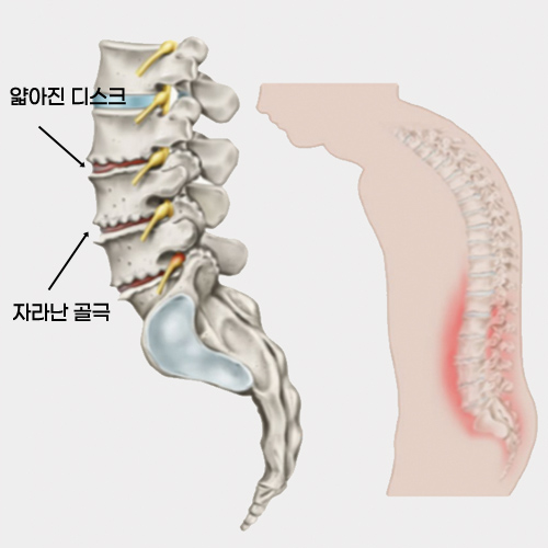 척추가 늙으면 디스크 안에 수분이 빠져나와 납작해지고 '골근'이라는 뼈가 자라게 됩니다.
